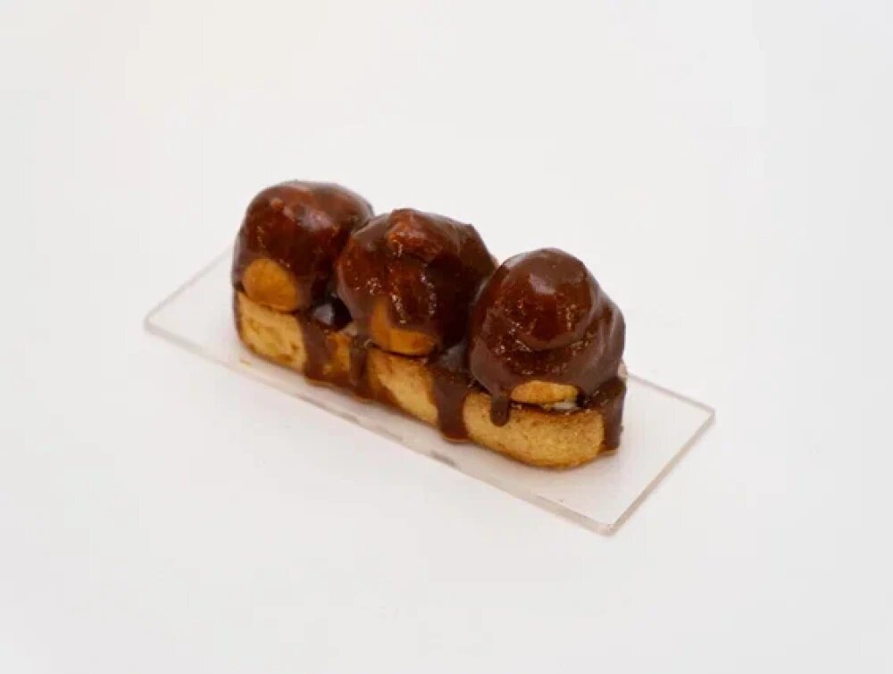 Хрустящая тарталетка на основе миндальной муки с миксом заварных кремов, нежными профитролями и политая карамелью собственного приготовления