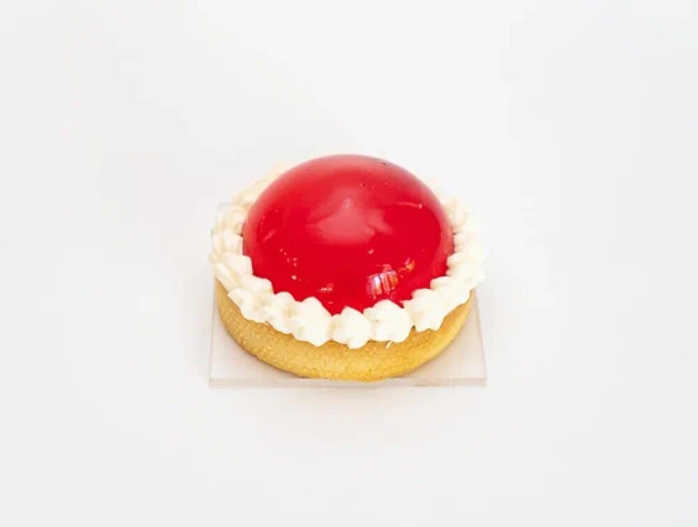 Песочная тарталетка на основе миндальной муки с нежным сливочным заварным кремом и чиз кремом. Украшается сферой из желе