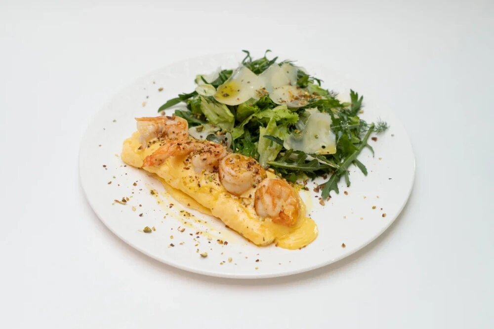 Воздушный омлет с голландским соусом и тигровыми креветками