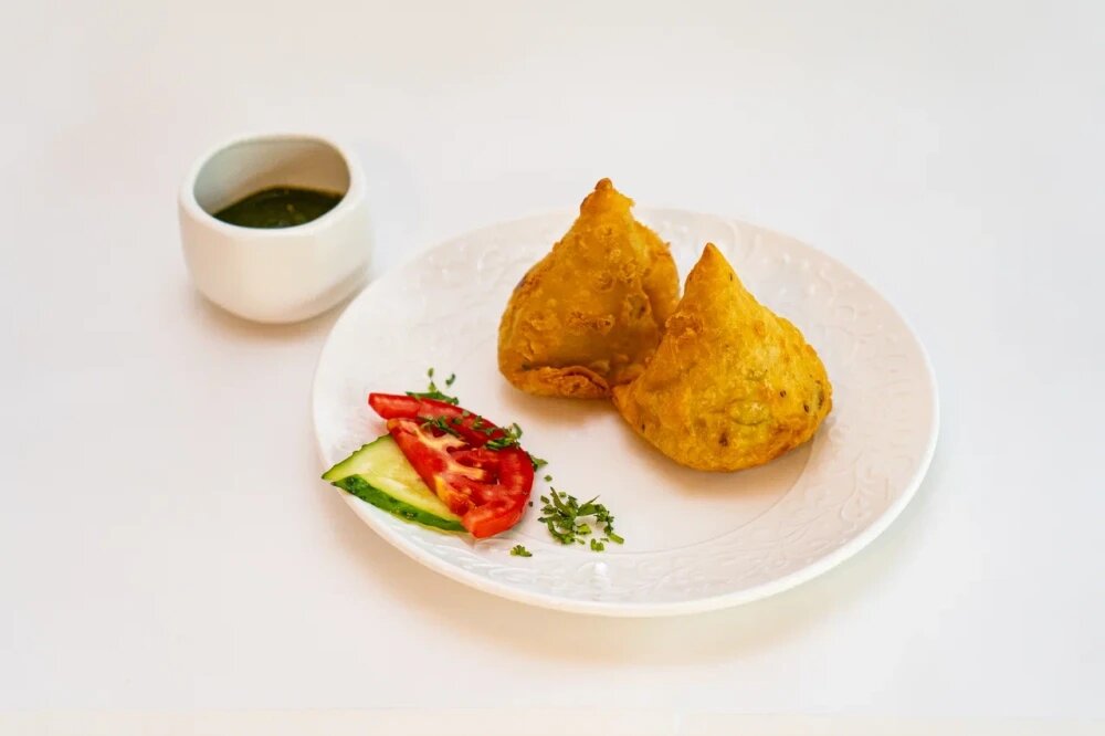 Хрустящие пирожки с начинкой из картофеля, зеленого горошка и специй. Подается с зеленым соусом.