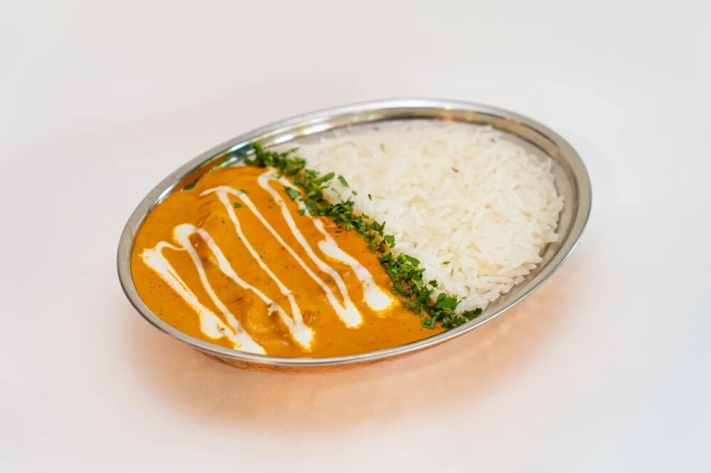 Кусочки нежной курицы с индийскими специями в сочном луково-томатном соусе. Подается с рисом басмати