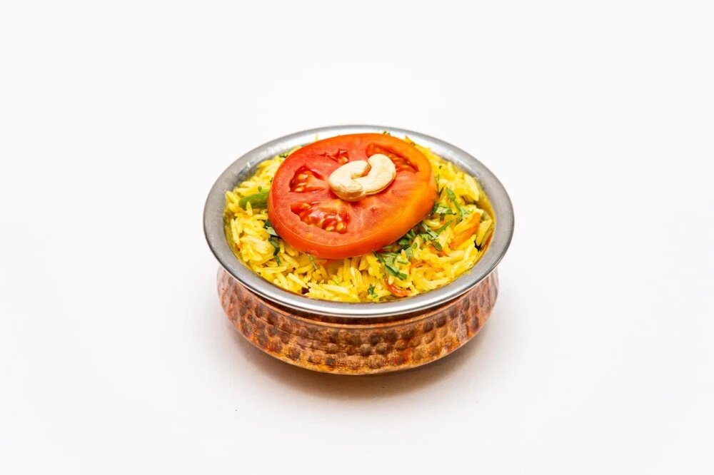 Вегетарианский плов или припущенный рис с овощами и специями. Подается с соусом Райта.