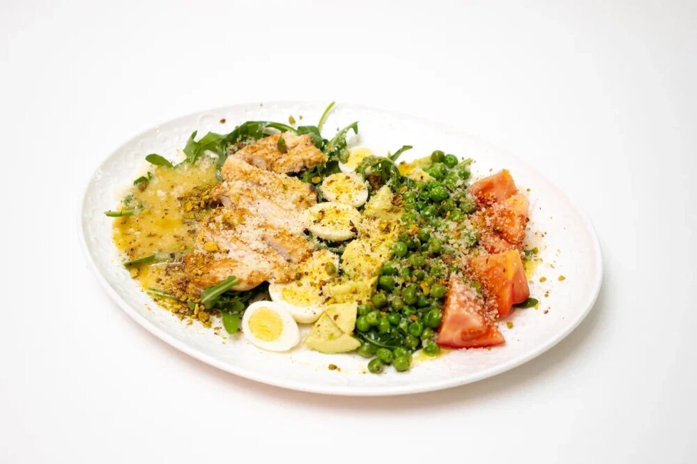 Традиционный кобб салат из цыпленка обжаренного на гриле, овощей, зеленого горошка, авокадо и перепелиного яйца под сыром пармезан. Заправляется медово-горчичным соусом.