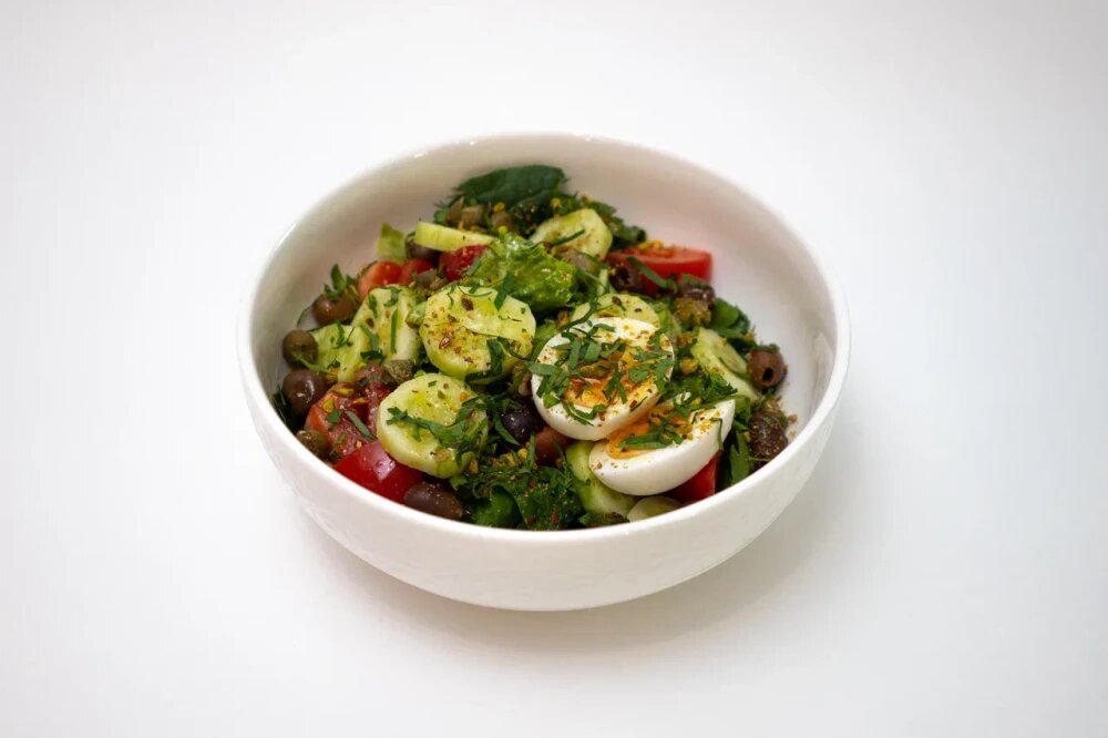 Летний салат из отборных свежих овощей, листьев салата, отварного яйца и зелени. Заправляется оливковым маслом