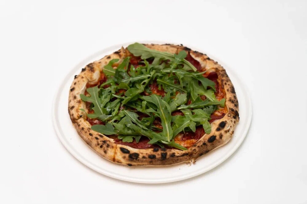 Неополитанская пицца из копченого мяса телятины, томатного соуса, сыра моцарелла и руккола