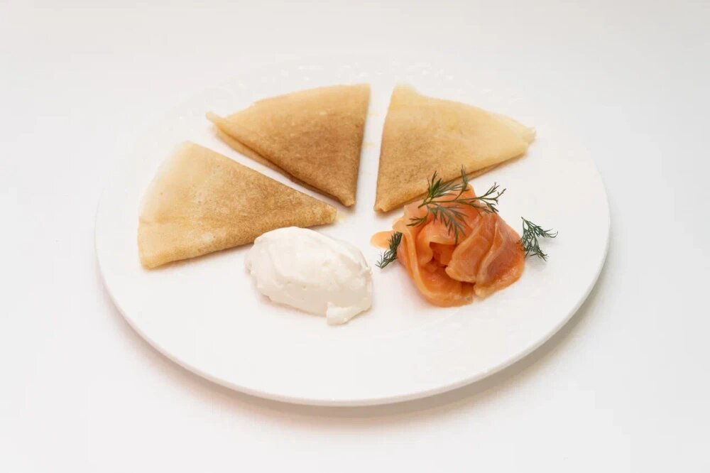 Тонкие, нежные блины со слабосоленым лососем. Подаются с фирменным кремом