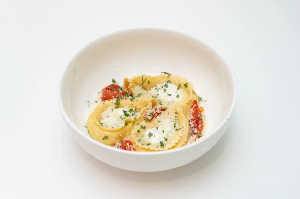 Итальянские пельмени из тонкого теста с начинкой из курицы, сыра креметта, соусом из сливочного масла и сладкого перца