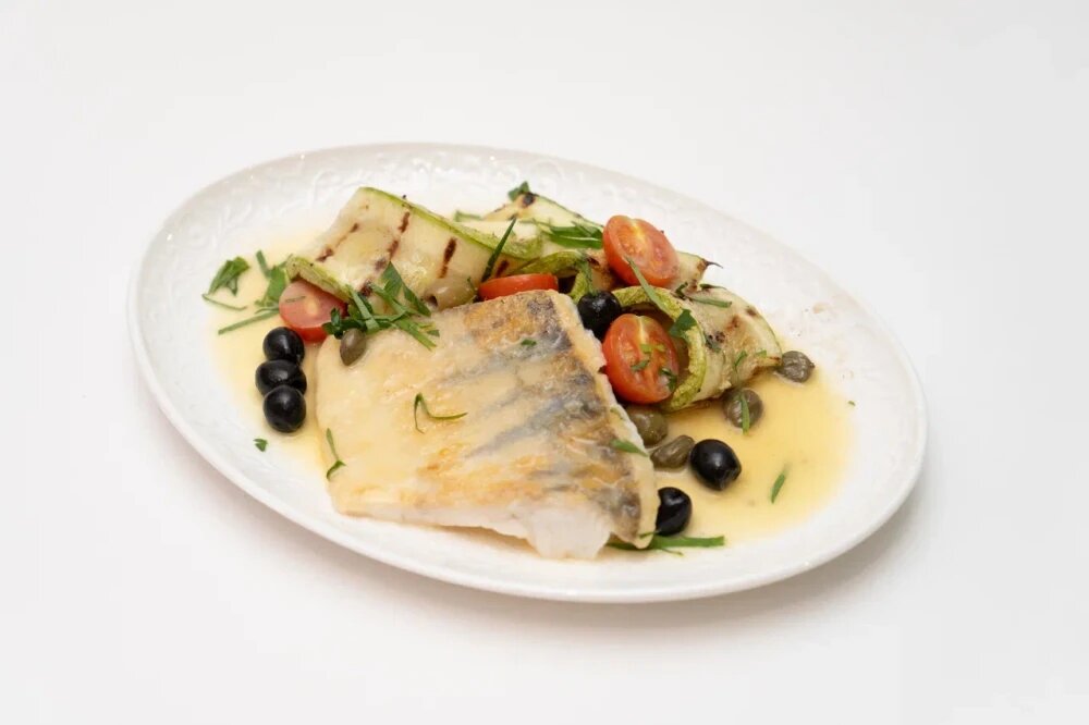 Жареное филе судака с цукини, помидорами черри, оливками, маслинами, каперсами и соусом на основе сливочного масла