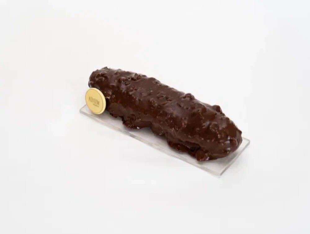 Классический эклер с начинкой из темного шоколадного мусса, хрустящей прослойкой из темного шоколада, вафельной крошки и фундука. Поливается бельгийским шоколадом с фундуком