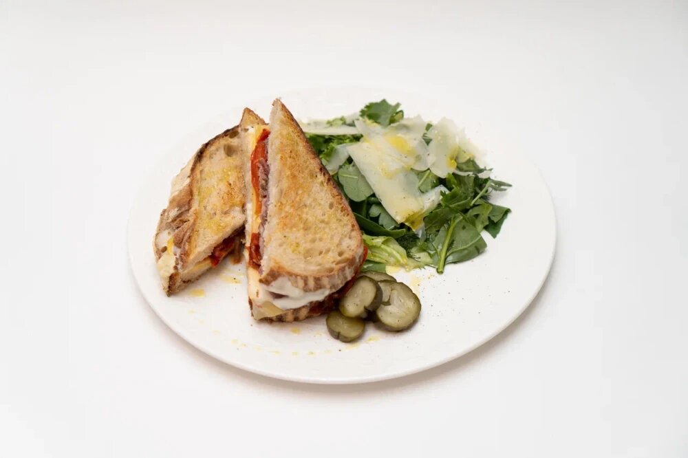 Сэндвич с пастрами, соусом бешамель, миксом сыров и сладким маринованным перцем. Подается с миксом салата, солеными огурцами и слайсами пармезана.